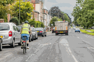 The road is wet. Why would a motorcyclist steer around drain covers while they were cornering?