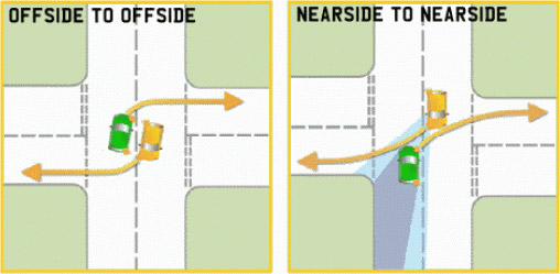 The nearside to nearside method is less safe than the above method, however, it is frequently practised by drivers. The reason it is unsafe is that you are unable to see oncoming traffic as the vehicle waiting to turn in front is blocking your view. This situation is especially unsafe if there is a big vehicle turning (such as a truck). Using this technique can put cyclists and motorcyclists at risk as they are hard to see when using the nearside to nearside method.
