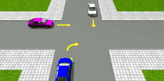 If you are turning left at the crossroads or going straight ahead, the priority would be yours over anyone on the opposite side of the road that is turning right (which is your left turn). Even though priority is yours, this may not always be given to you so make sure you always observe the actions of other drivers in case they cut across you.