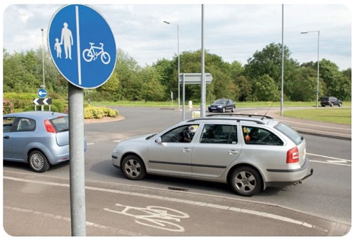 Be aware of cyclists at a roundabout. They’re slower and more vulnerable than other road users, and may decide to stay in the left-hand lane whatever direction they’re planning to take. Hold back and give them plenty of room.